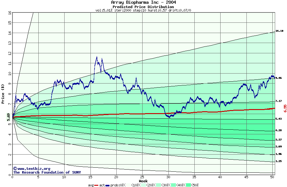 The following graph plots the year-to-date performance of the stock for 2004 compared to the probability calculated by a random walk model.