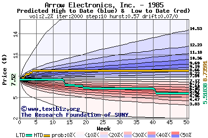 The high to date and low to date prices of the stock plotted against a random walk model for 1985 (what's this?).