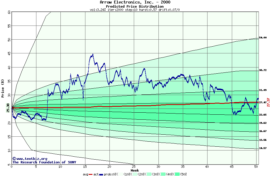 The following graph plots the year-to-date performance of the stock for 2000 compared to the probability calculated by a random walk model.
