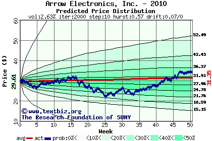 The high to date and low to date prices of the stock plotted against a random walk model for 2010 (what's this?).