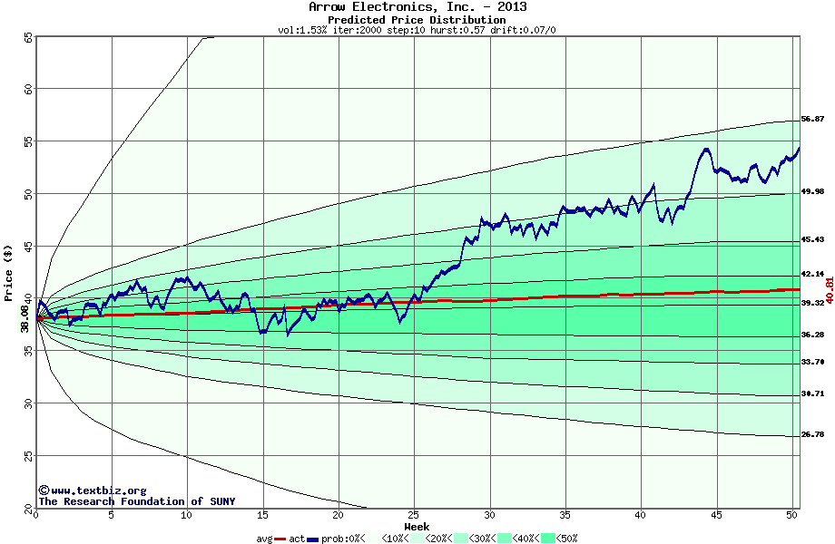 The following graph plots the year-to-date performance of the stock for 2013 compared to the probability calculated by a random walk model.