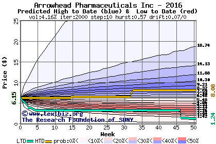 The high to date and low to date prices of the stock plotted against a random walk model for 2016 (what's this?).