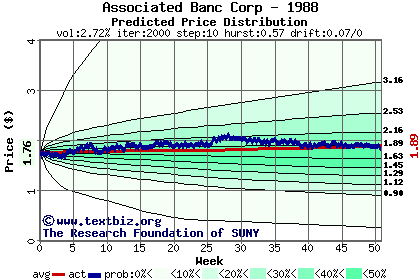 The high to date and low to date prices of the stock plotted against a random walk model for 1988 (what's this?).