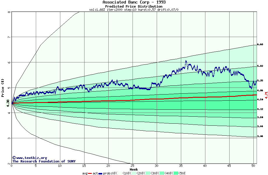 The following graph plots the year-to-date performance of the stock for 1993 compared to the probability calculated by a random walk model.