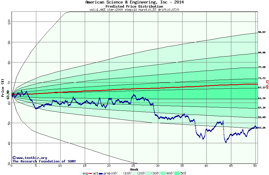The following graph plots the year-to-date performance of the stock for 2014 compared to the probability calculated by a random walk model.