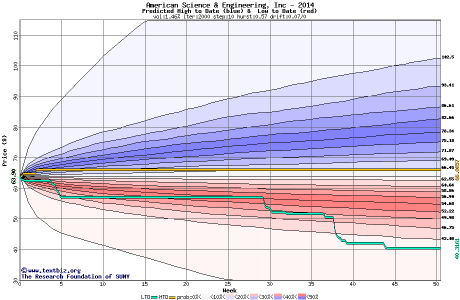 The high to date and low to date prices of the stock plotted against a random walk model for 2014 (what's this?).