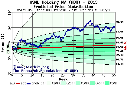 The high to date and low to date prices of the stock plotted against a random walk model for 2013 (what's this?).
