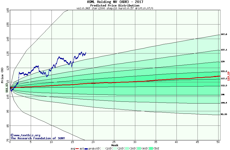 The following graph plots the year-to-date performance of the stock for 2017 compared to the probability calculated by a random walk model.