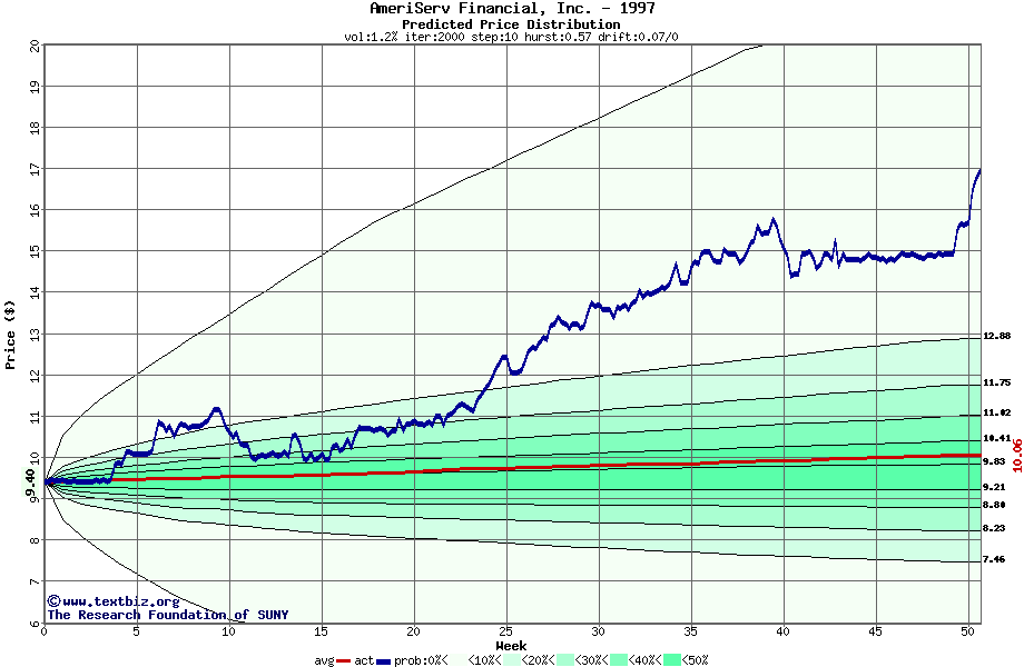 The following graph plots the year-to-date performance of the stock for 1997 compared to the probability calculated by a random walk model.