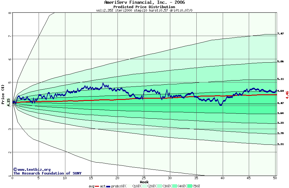 The high to date and low to date prices of the stock plotted against a random walk model for 2006 (what's this?).