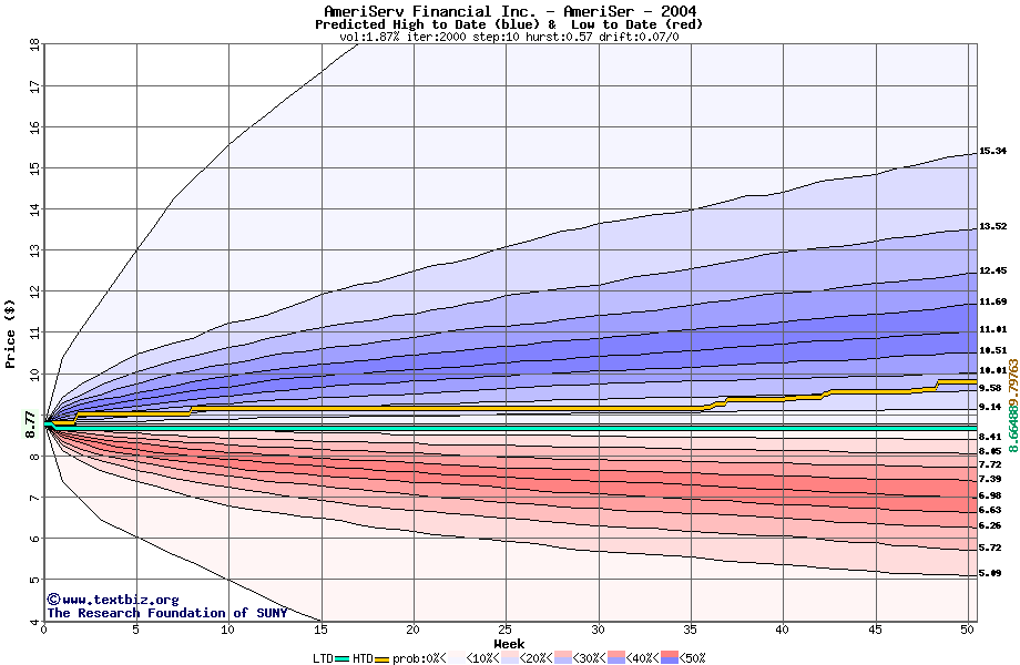 The high to date and low to date prices of the stock plotted against a random walk model for 2004 (what's this?).