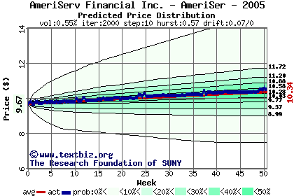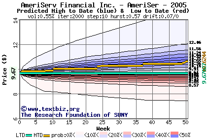 The high to date and low to date prices of the stock plotted against a random walk model for 2005 (what's this?).