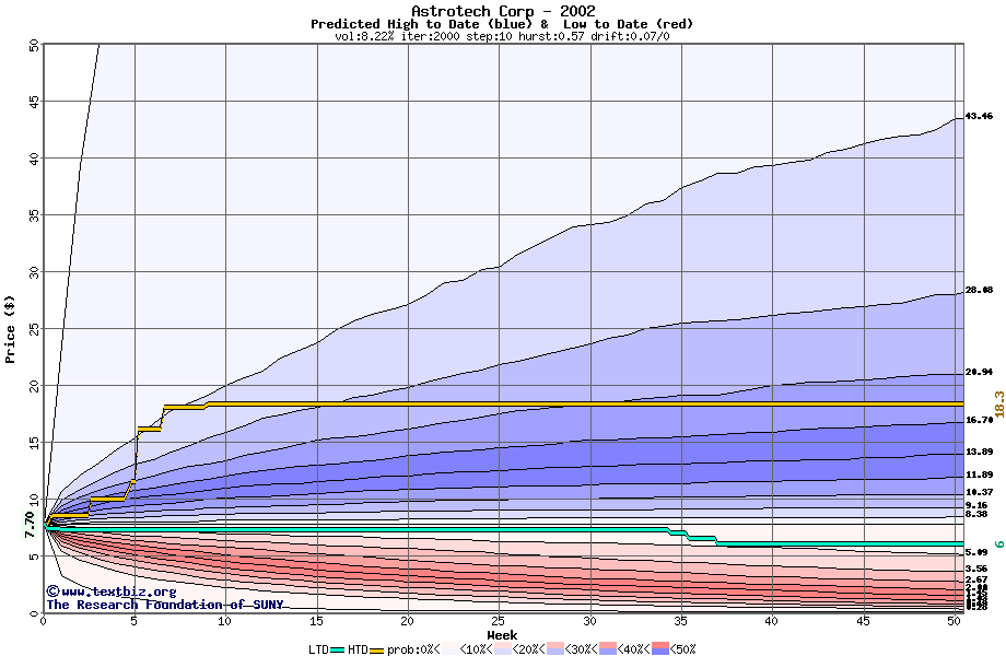 The high to date and low to date prices of the stock plotted against a random walk model for 2002 (what's this?).