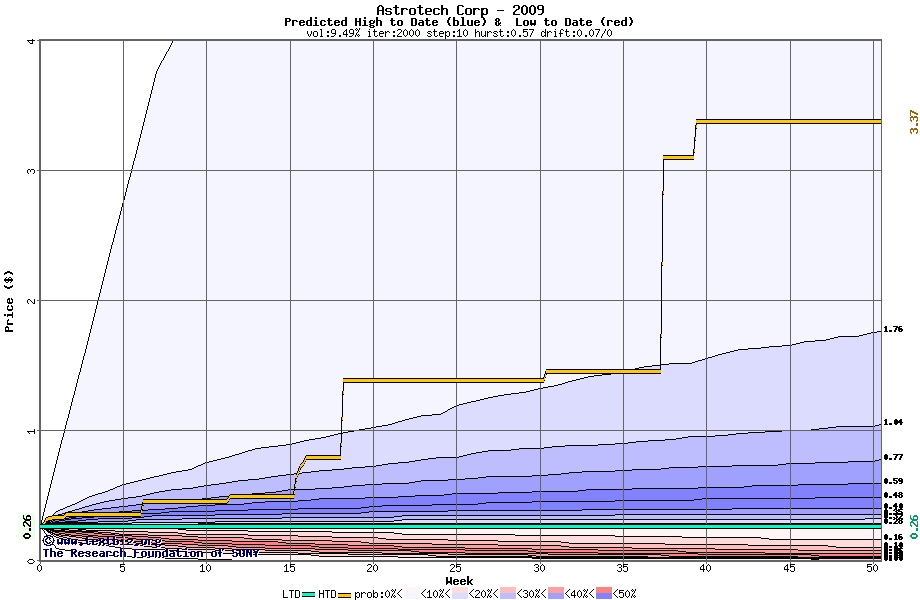 The high to date and low to date prices of the stock plotted against a random walk model for 2009 (what's this?).