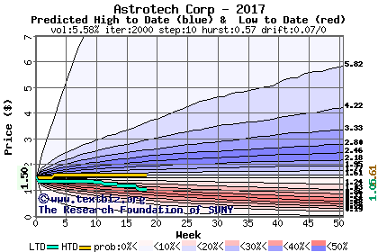 The high to date and low to date prices of the stock plotted against a random walk model for 2017 (what's this?).