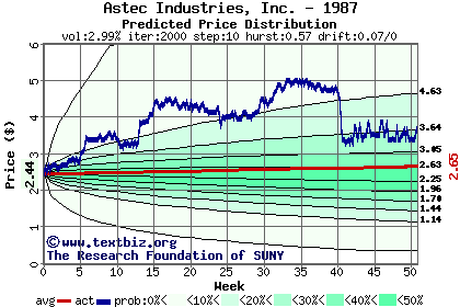 The high to date and low to date prices of the stock plotted against a random walk model for 1987 (what's this?).