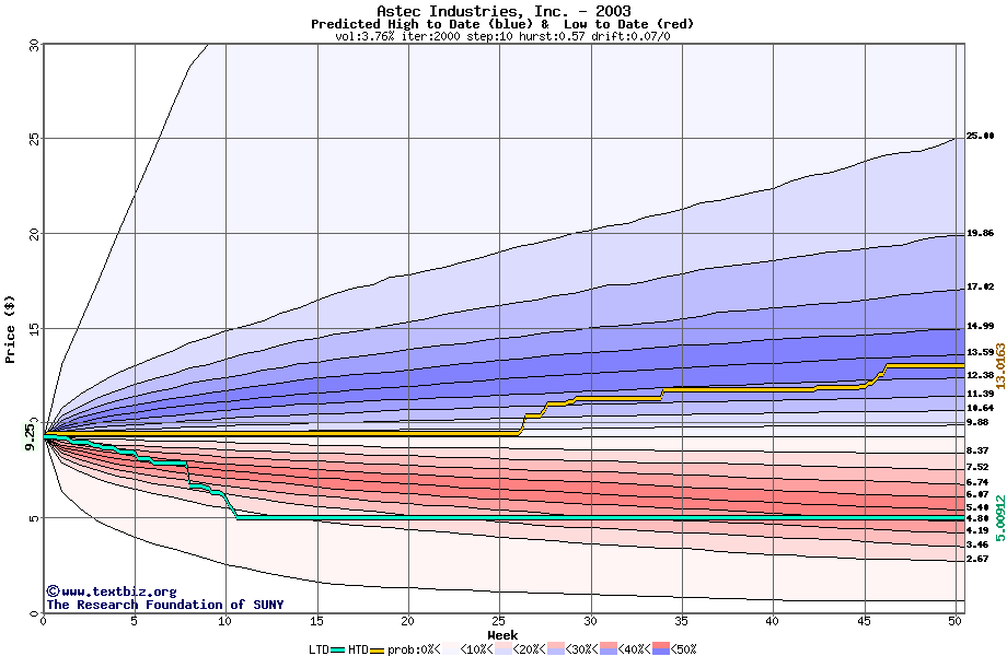 The high to date and low to date prices of the stock plotted against a random walk model for 2003 (what's this?).
