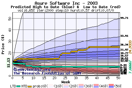 The high to date and low to date prices of the stock plotted against a random walk model for 2003 (what's this?).