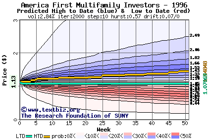 The high to date and low to date prices of the stock plotted against a random walk model for 1996 (what's this?).