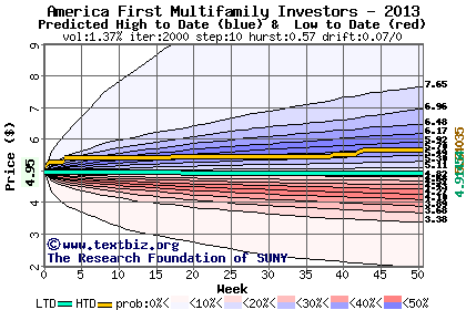 The high to date and low to date prices of the stock plotted against a random walk model for 2013 (what's this?).