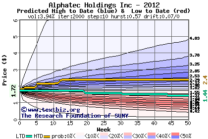 The high to date and low to date prices of the stock plotted against a random walk model for 2012 (what's this?).
