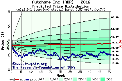 The high to date and low to date prices of the stock plotted against a random walk model for 2016 (what's this?).