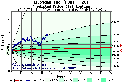 The high to date and low to date prices of the stock plotted against a random walk model for 2017 (what's this?).