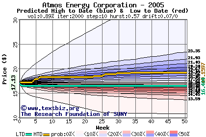 The high to date and low to date prices of the stock plotted against a random walk model for 2005 (what's this?).