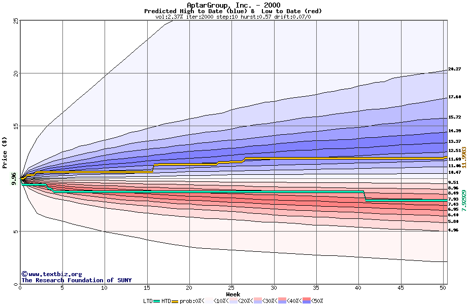 The high to date and low to date prices of the stock plotted against a random walk model for 2000 (what's this?).