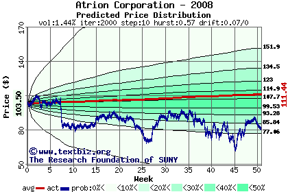The high to date and low to date prices of the stock plotted against a random walk model for 2008 (what's this?).