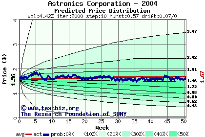 The high to date and low to date prices of the stock plotted against a random walk model for 2004 (what's this?).