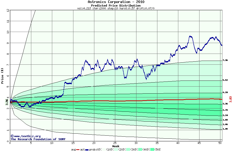 The following graph plots the year-to-date performance of the stock for 2010 compared to the probability calculated by a random walk model.