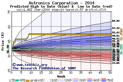 The high to date and low to date prices of the stock plotted against a random walk model for 2014 (what's this?).