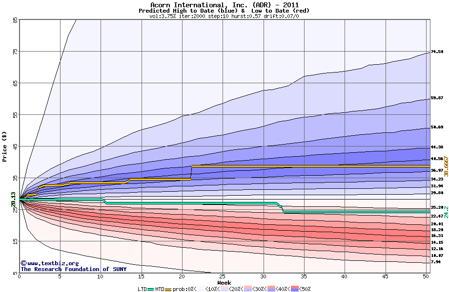 The high to date and low to date prices of the stock plotted against a random walk model for 2011 (what's this?).