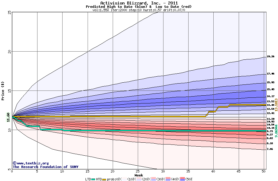 The high to date and low to date prices of the stock plotted against a random walk model for 2011 (what's this?).