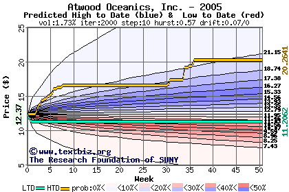 The high to date and low to date prices of the stock plotted against a random walk model for 2005 (what's this?).