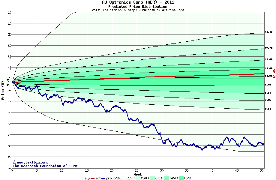 The following graph plots the year-to-date performance of the stock for 2011 compared to the probability calculated by a random walk model.