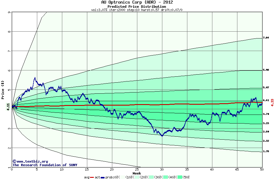The following graph plots the year-to-date performance of the stock for 2012 compared to the probability calculated by a random walk model.