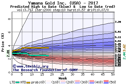 The high to date and low to date prices of the stock plotted against a random walk model for 2017 (what's this?).
