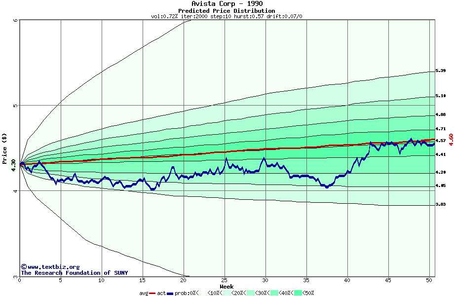 The following graph plots the year-to-date performance of the stock for 1990 compared to the probability calculated by a random walk model.
