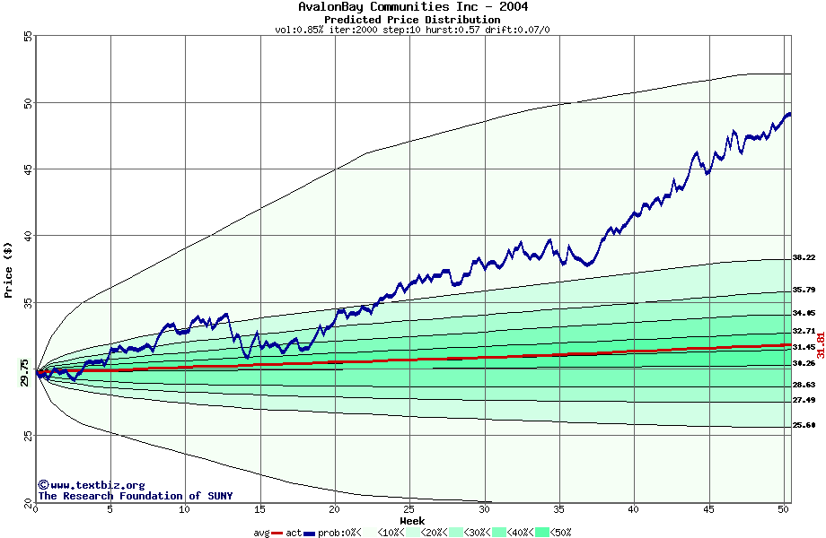 The following graph plots the year-to-date performance of the stock for 2004 compared to the probability calculated by a random walk model.
