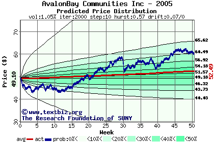 The following graph plots the year-to-date performance of the stock for 2005 compared to the probability calculated by a random walk model.