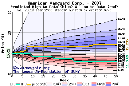The high to date and low to date prices of the stock plotted against a random walk model for 2007 (what's this?).