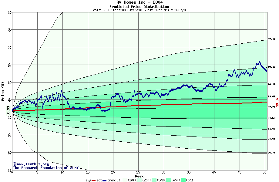 The following graph plots the year-to-date performance of the stock for 2004 compared to the probability calculated by a random walk model.
