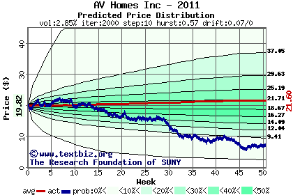 The high to date and low to date prices of the stock plotted against a random walk model for 2011 (what's this?).