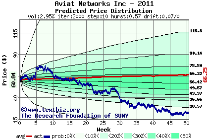 The high to date and low to date prices of the stock plotted against a random walk model for 2011 (what's this?).