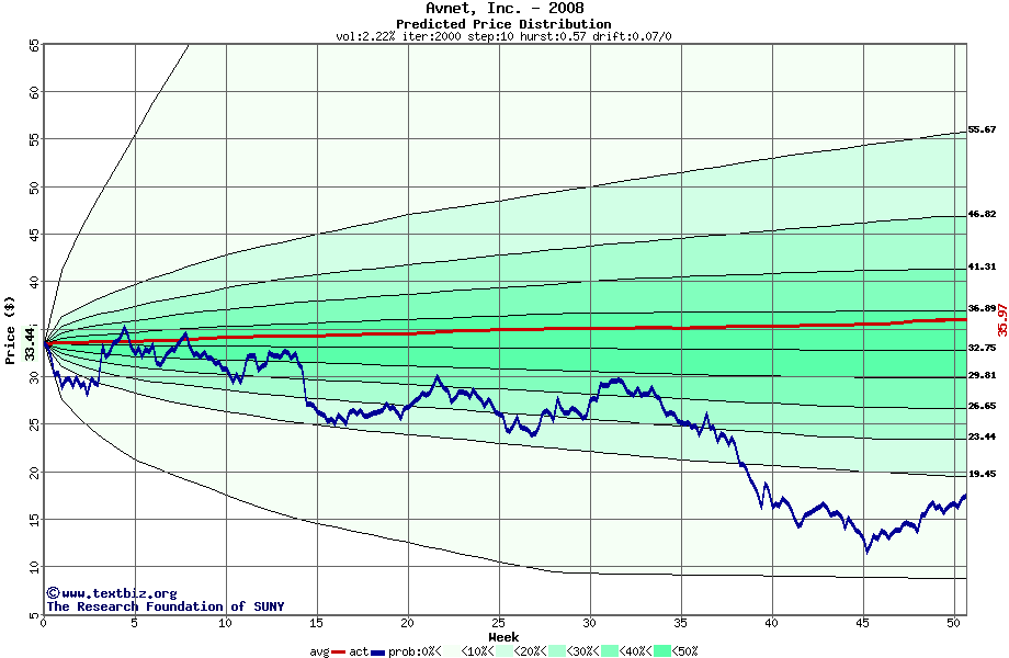 The following graph plots the year-to-date performance of the stock for 2008 compared to the probability calculated by a random walk model.