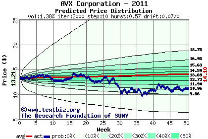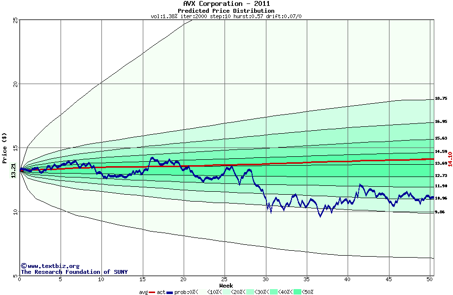 The high to date and low to date prices of the stock plotted against a random walk model for 2011 (what's this?).