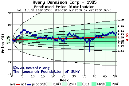 The high to date and low to date prices of the stock plotted against a random walk model for 1985 (what's this?).