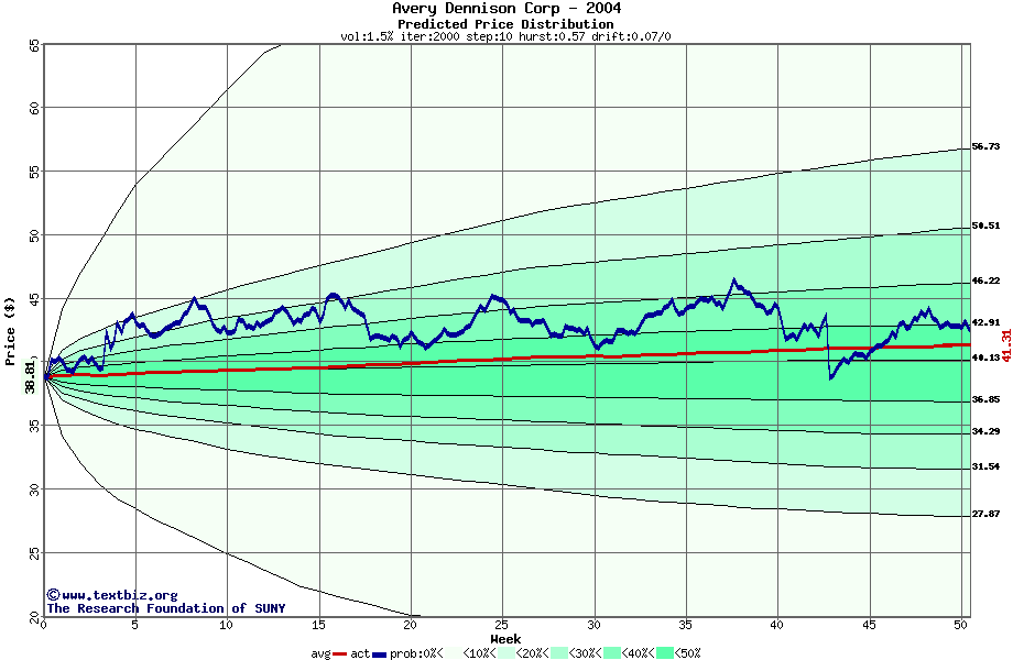 The high to date and low to date prices of the stock plotted against a random walk model for 2004 (what's this?).